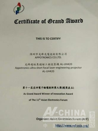 光峰光電超短焦激光投影機(jī)AL-UH420獲獎(jiǎng)證書(shū)