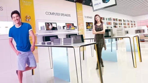 店鋪的布局也遵循了同樣的創(chuàng)意。我們把產(chǎn)品體驗放在中心區(qū)域,四周的墻面作為陳列。“旅行家的選擇”用來重點突出適合旅行的產(chǎn)品。黑色與金色融合的金屬絲帶挑戰(zhàn)了任何現(xiàn)存的聲音產(chǎn)品展示方式。意在用輕盈的展示表達未來感。