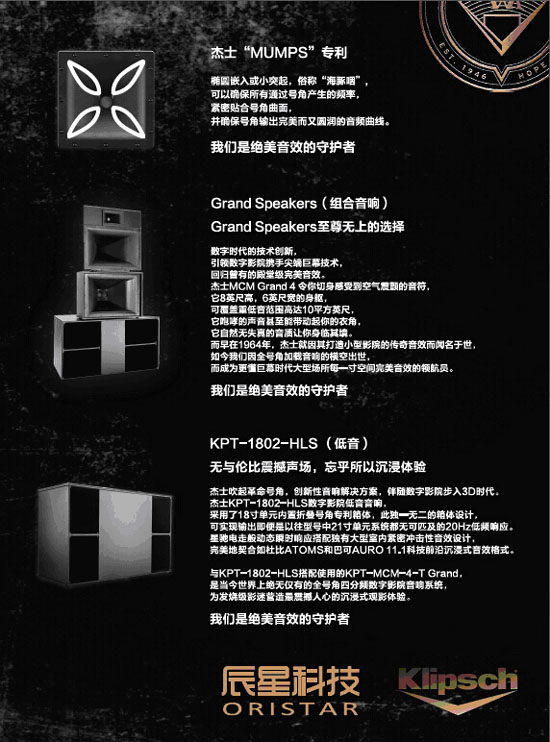 Klipsch在技術(shù)上精益求精,它的產(chǎn)品遍及全球80多個國家,無論在家庭音響系統(tǒng)、電子領(lǐng)域、還是在專業(yè)的影院、商務(wù)設(shè)備應(yīng)用方面都可以看到Klipsch的產(chǎn)品。2015年,美國杰士音響與辰星公司達成戰(zhàn)略合作,正式進入中國影院市場。選擇辰星科技作為其最大合作伙伴,雙方將共同合力,勢必堅定地把國外極具價值的品牌和產(chǎn)品引進中國,惠及中國廣大影迷。