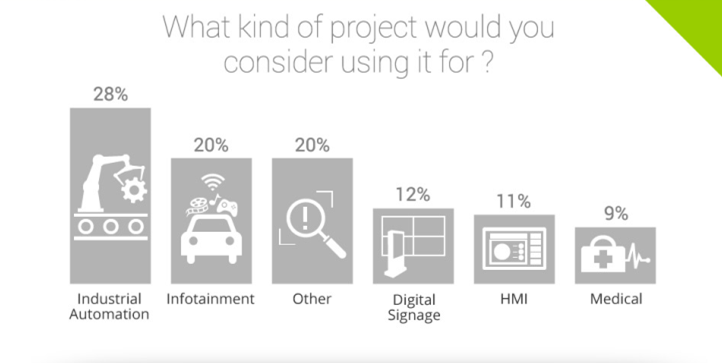 近50%的受訪者認(rèn)為,嵌入式Android系統(tǒng)主要適用于工業(yè)自動(dòng)化和車載娛樂系統(tǒng)中。 而數(shù)字標(biāo)牌、人機(jī)互動(dòng)和醫(yī)療也被認(rèn)為是嵌入式Android系統(tǒng)的重要應(yīng)用方向。