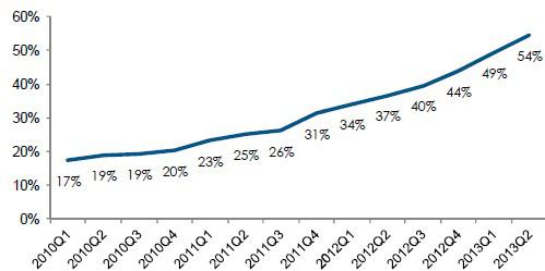 從數(shù)據(jù)中可以看出早已超過50%的滲透率,從終端產(chǎn)品的角度看,未來典型智能終端滲透率將會持續(xù)提升,當(dāng)然,智能化的發(fā)展也將以手機(jī)為核心逐漸的升級擴(kuò)散。