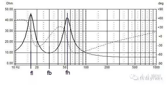 在上圖中,倒相箱的阻抗曲線形成了兩個(gè)明顯的峰,兩峰中夾著一個(gè)谷,這就是倒相箱阻抗曲線的典型形狀。其中,頻率較低的峰的頻率可記作fl,頻率較高的峰對(duì)應(yīng)的頻率可記為fh,而谷的位置記為fb。fb就是倒相管與箱體共同組成的一個(gè)亥姆霍茲共鳴腔的諧振頻率,簡(jiǎn)單地說,就是倒相箱的諧振頻率,fb的b就是box的簡(jiǎn)寫。(附加一個(gè)問題,這個(gè)頻率與單元的參數(shù)有沒有關(guān)系?)
