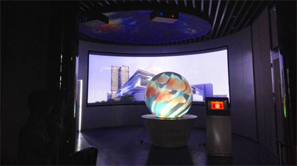 它打破了以往投影圖像只能是平面規(guī)則圖形的局限,利用特殊的光學鏡頭,將普通的平面影像進行特殊的變換,投射到一個球形的屏幕內,形成一個內投的球體影像。內投球采用高流明的投影機,高分辨率技術可以播放各種經過視頻變幻的影像,使整個球體看起來就像一個科幻的大球,可以很好的吸引參觀者的眼球,該產品主要應用于科普教育、展覽展示、廣告娛樂和虛擬仿真等領域。本球幕通過3臺視美樂SML-PF500工程投影機采用多機疊加,實現(xiàn)亮度提高,圖像無損的顯示效果。將球幕亮度提高三倍,完美解決現(xiàn)場環(huán)境光過高的缺憾。