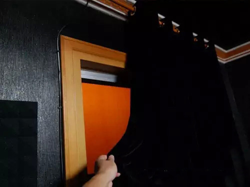 打開后里面還有一層遮光布。現(xiàn)在大白天不開燈,客廳已基本伸手不見五指。