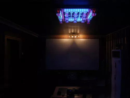 網(wǎng)上買的,全遙控,多種燈光變幻,價格雖然不到600,但安裝著實麻煩。請來兩個專業(yè)師傅弄了一個下午。燈光氛圍可以為影院營造愉悅的氣氛。不是嗎?