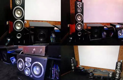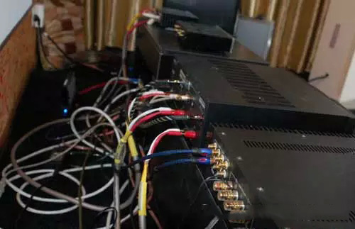 現(xiàn)在來說說環(huán)繞。最初玩的時候,進的是JBL的旗艦衛(wèi)星箱CV50。升級后就做環(huán)繞了。五只參數(shù)完全一樣的箱子分別做側環(huán),增寬,還有一只與樂富豪的老箱子拉郎配做后環(huán)。
