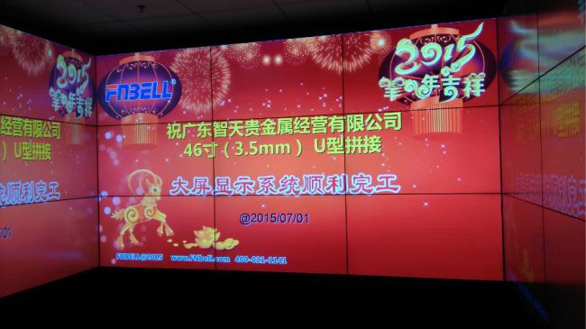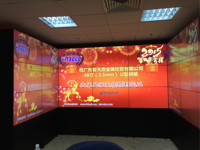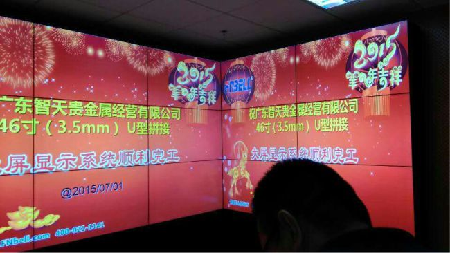 峰寧科技根據(jù)智天貴金屬的設(shè)計需求,峰寧科技為其演播室設(shè)計了一組3x7 21片46寸液晶U形拼接墻。