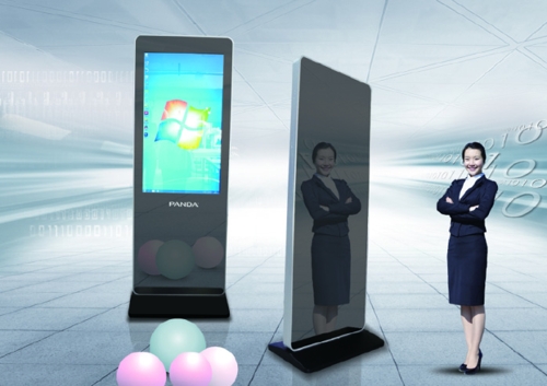 熊貓商顯全新推出的55寸感應(yīng)式鏡面廣告機(jī)(當(dāng)客人接近鏡面廣告機(jī)時,通過紅外感應(yīng)到人體。原來鏡子的其中一塊區(qū)域,立刻播放廣告。當(dāng)客人離開時,自動恢復(fù)為鏡面.)閃動式的鏡面廣告機(jī)(不帶紅外感應(yīng)頭,顯示的廣告畫面循環(huán)切換。其中熊貓電子集團(tuán)的鏡面廣告機(jī),切換速度可調(diào)。切換方式可調(diào)(漸變切換,或跳動切換))