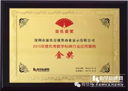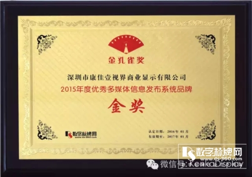 而數(shù)字標(biāo)牌行業(yè)2015年度行業(yè)最高榮譽(yù)獎(jiǎng)項(xiàng)—“金孔雀金獎(jiǎng)”——《優(yōu)秀多媒體信息發(fā)布系統(tǒng)品牌金獎(jiǎng)》《優(yōu)秀數(shù)字標(biāo)牌行業(yè)應(yīng)用案例金獎(jiǎng)》,兩度花落康佳壹視界商顯,不僅是對(duì)康佳壹視界取得成績的鼓勵(lì),更是對(duì)康佳壹視界互聯(lián)網(wǎng)+戰(zhàn)略的高度認(rèn)可!