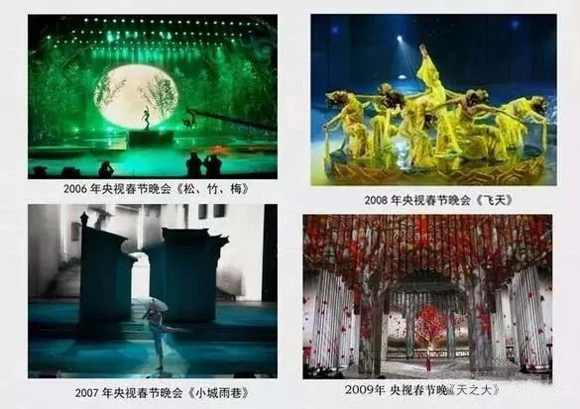 2006年央視春晚舞臺設計首次運用“水”,借助水幕的磅礴氣勢之美與水上舞臺的溫柔之美形成強烈的對比,營造出一個美輪美奐的水上實景舞臺;2007年央視春晚的舞蹈節(jié)目《小城雨巷》首次將大屏幕的三維虛擬成像影像與實景道具進行了很好的視覺結合;2008年央視春晚舞美設計首次采用了“地屏”營造出“人在畫中游”的唯美藝術表達方式;2009年央視春晚舞美設計的720根紗筒,結合著高科技數(shù)字投影燈營造出來的夢幻視覺畫面贏得了億萬觀眾的好評。