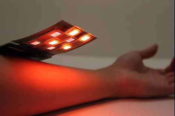 加州大學(xué)的工程師開(kāi)發(fā)出一種柔性O(shè)LED傳感器來(lái)偵測(cè)皮膚、組織和器官的血氧。該裝置表面是有機(jī)光電探測(cè)器,底部是紅光OLED和紅外OLED。該產(chǎn)品的有機(jī)電子元件是印刷在可彎曲塑膠上,并根據(jù)身體的輪廓塑性,傳感器檢測(cè)范圍以網(wǎng)格狀為單位,可檢測(cè)網(wǎng)格中九個(gè)節(jié)點(diǎn)的血氧水平,并可放置在皮膚的任何位置。