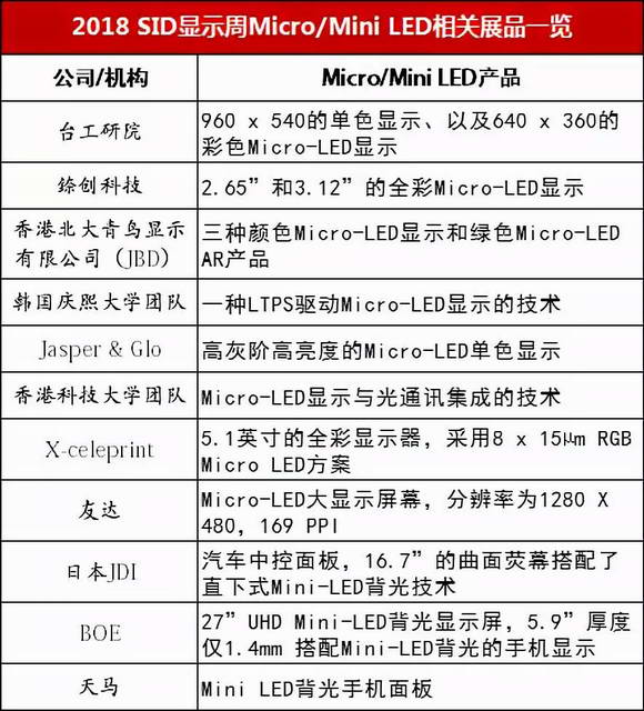 在2018 SID顯示周上,臺工研院、錼創(chuàng)科技、香港北大青鳥顯示有限公司(JBD)、韓國慶熙大學(xué)團隊、Jasper & Glo、香港科技大學(xué)團隊、X-celeprint、友達(dá)、日本JDI、BOE、天馬紛紛展示了Mini LED 和Micro-LED的最新產(chǎn)品。