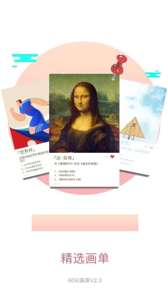 BOE畫屏在海量的圖像庫中,根據(jù)圖像主題,藝術(shù)類別,裝飾場景和情感內(nèi)涵等分類,為你精心打造了幾千個畫單,你可以pick你喜愛的畫單,也可以自己親自制作畫單,表達你的心情,等待著有人穿越茫茫畫海,給你的畫單比個小心心。