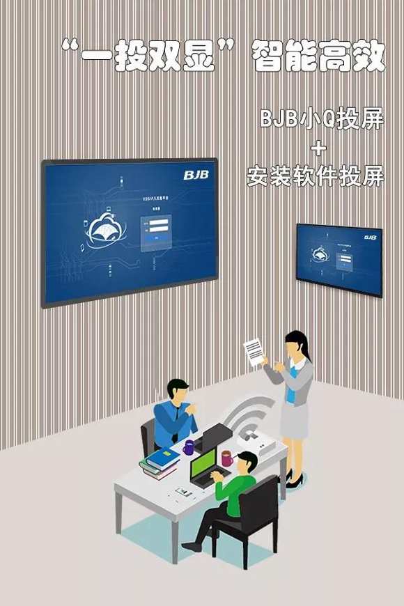 對于Windows版本設備使用Q-Share,可實現(xiàn)“一投雙顯”,即筆記本通過插入小Q可以將內容投屏到一塊屏幕,再通過安裝投屏軟件利用本身無線網(wǎng)卡將屏幕內容投屏到另一塊屏幕。如果您的會議室面積較大且與會人數(shù)眾多時,這個功能可以助您一臂之力。