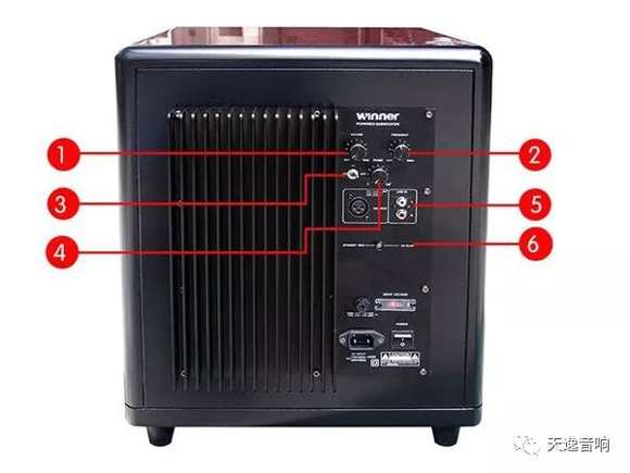 ❺第三排是兩個(gè)輸入低音信號(hào)的接口,左邊為專業(yè)級(jí)別的平衡輸入端,右邊為普通的蓮花端子輸入口,對(duì)應(yīng)于AV功放的低音炮輸出端子連接即可。