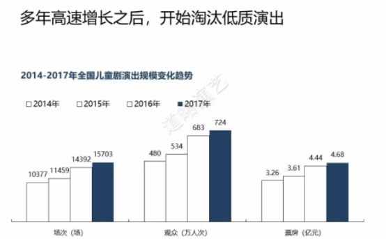 兒童劇到底有多火爆?數(shù)據(jù)是不會(huì)撒謊的,根據(jù)道略演藝的統(tǒng)計(jì),兒童演藝自2014年起不論是場(chǎng)次、觀眾還是票房都呈現(xiàn)逐年遞增的態(tài)勢(shì),在2017年全年有超過15000場(chǎng)兒童演藝,觀眾人數(shù)達(dá)到724萬人次,票房達(dá)到4.68億元。