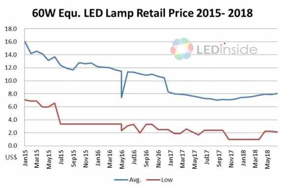 LEDinside自LED照明市場發(fā)展之初即開始追蹤市場價格信息,根據(jù)LEDinside的歷史數(shù)據(jù),以一顆相當(dāng)于60瓦的LED燈泡價格來看,此價格在2011年一月時約45-50美元一顆,到了2018年七月,價格卻已經(jīng)下滑至不到10美元。
