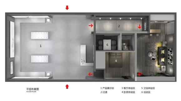 產品體驗區(qū),設計了客廳、臥室、廚房、洗手間四個家庭場景,整體布局采取人流動線,通過縱深的通道設計串聯(lián)起產品區(qū)與體驗區(qū)兩個空間,是對智能科技無限的遐想。