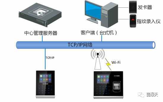 考勤系統(tǒng)主要由三部分組成:前端設(shè)備、傳輸網(wǎng)絡(luò)和管理中心。系統(tǒng)架構(gòu)如下圖所示: