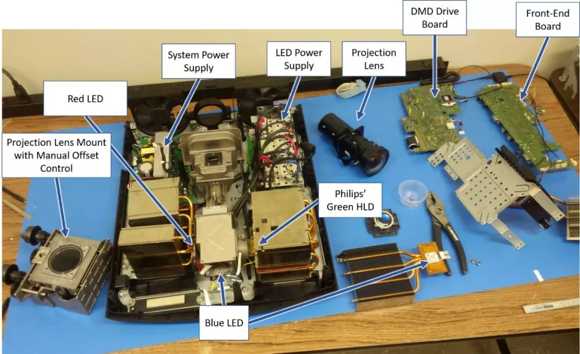 李俐表示:飛利浦投影事業(yè)部走LED光源這條路線,主要原因是LED的色彩表現(xiàn)好。我們投入了大量的研發(fā)經(jīng)費(fèi),HLD并不是對LED簡單的改造,而是全新的創(chuàng)新,相較于原來的LED芯片,HLD模組最大的優(yōu)勢就是亮度的大幅提升。HLD的核心技術(shù)是芯片里的光棒,光棒里面按照一定的化學(xué)工藝填充了轉(zhuǎn)換的化學(xué)物質(zhì),光棒上下兩面貼上藍(lán)色的LED芯片,發(fā)出藍(lán)色光并投射到光棒上,再轉(zhuǎn)換成綠、黃、紅等各種需要的顏色光進(jìn)行收光,這種架構(gòu)的好處就是實(shí)現(xiàn)了亮度的急劇提升。光源亮度這個(gè)技術(shù)門檻的突破,讓品牌廠商看到了機(jī)會。