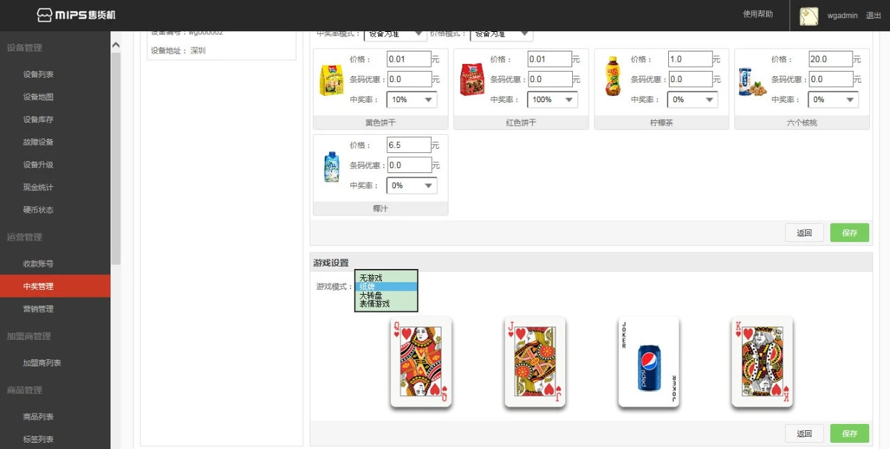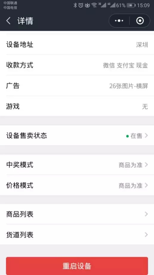 【設(shè)備詳情】板塊可以查看設(shè)備的所在地址、支持的收款方式、屏幕播放的廣告情況以及游戲情況,還可以查看設(shè)備的售賣狀態(tài),中獎模式和價格模式。