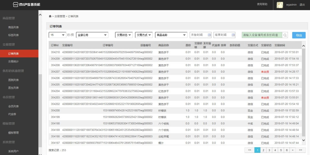 自動生成交易記錄,商家和運營商可設(shè)置篩選條件,比如按照商品、時間段、付款方式、終端設(shè)備、條形碼等查看訂單信息,并支持導(dǎo)出訂單數(shù)據(jù)。