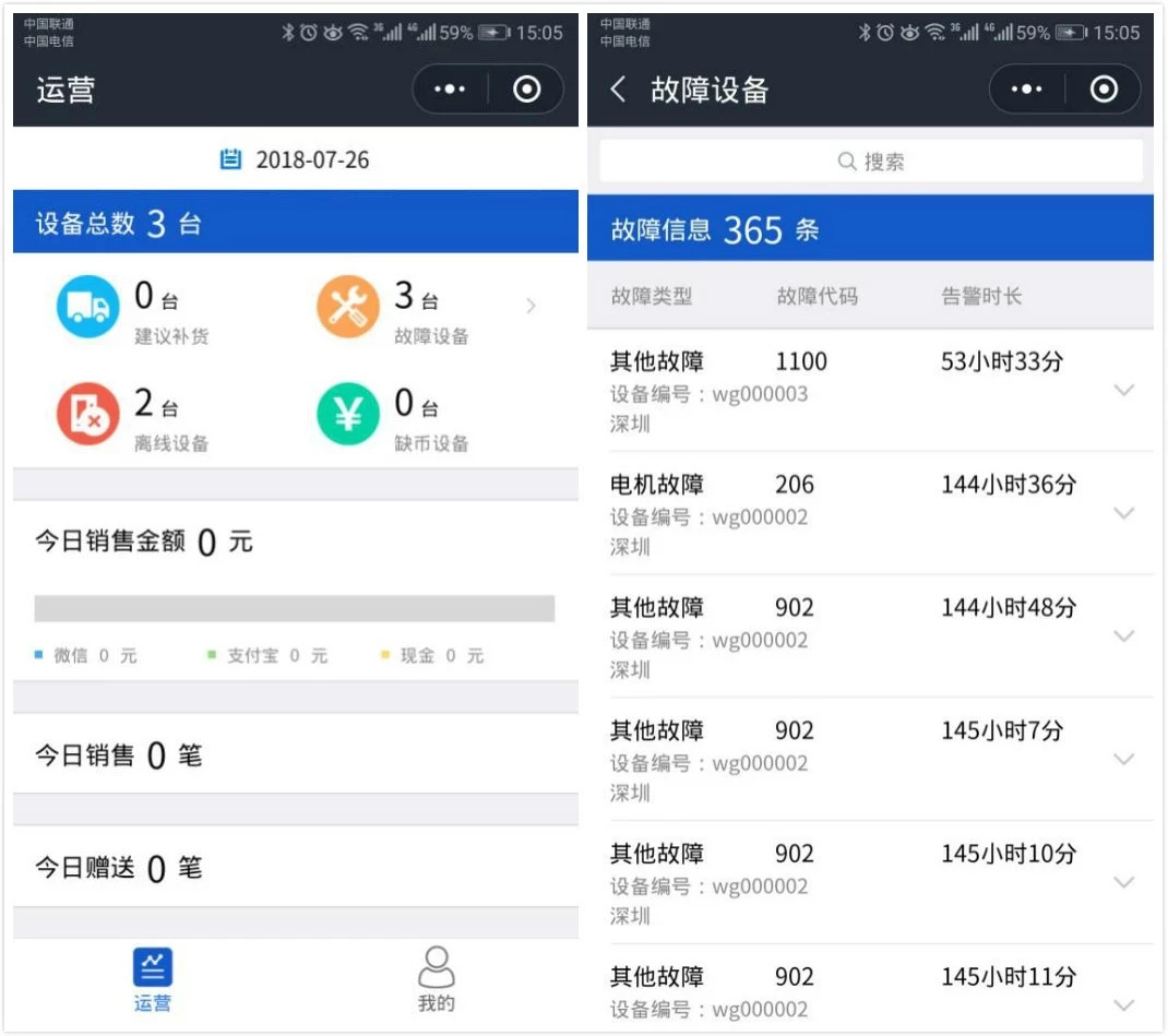 商家可以在【運營】板塊查看當(dāng)日銷售數(shù)據(jù)、售貨機的運營狀態(tài)(包括在線設(shè)備數(shù)量、故障設(shè)備、缺幣情況等)。點擊【故障設(shè)備】,可查看故障設(shè)備的報修信息,包括故障類型以及告警時長,便于商家及時處理設(shè)備故障。