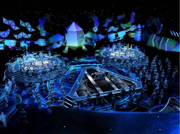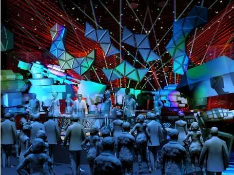 作為一檔貼近年輕群體的音樂(lè)節(jié)目,舞美整體設(shè)計(jì)偏向年輕化又極具科技感。兩個(gè)樂(lè)隊(duì)在對(duì)稱(chēng)方向的“飛碟”上進(jìn)行表演,中間設(shè)有可供表演的三角形嘉賓區(qū),弧形的評(píng)論區(qū)結(jié)合演播廳兩側(cè)的機(jī)械臂膀,最終形成未來(lái)感十足的機(jī)器人造型。
