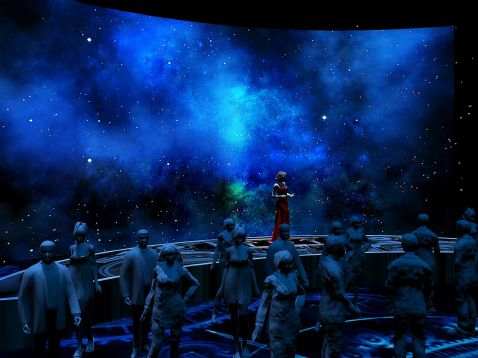 《超級(jí)樂(lè)隊(duì)》的舞臺(tái)強(qiáng)調(diào)視覺(jué)張力,同時(shí)要貼合搖滾樂(lè)隊(duì)的獨(dú)立自由精神,因此利用主屏幕影像與地屏共同造型,側(cè)面吊掛景片屏幕,進(jìn)行了影像的延展,輔以有節(jié)奏變幻的燈光,充分地拓展了太空的自由概念,在演播廳里渲染出星際的浩瀚神秘,寓示著不論是樂(lè)隊(duì)還是觀眾都可以在這無(wú)邊界的音樂(lè)世界中自由穿梭,踏上一個(gè)愉悅美妙的音樂(lè)旅程。