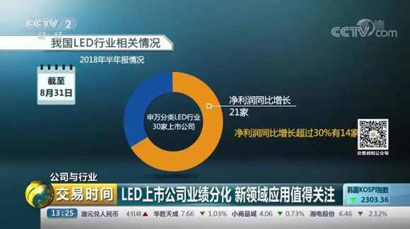 截至8月31日,今年中報(bào)業(yè)績(jī)中,申萬分類LED行業(yè)30家上市公司中,21家公司凈利潤(rùn)同比增長(zhǎng),其中凈利潤(rùn)同比增長(zhǎng)超過30%的有14家,凈利潤(rùn)同比增長(zhǎng)超過100%的有3家,分別是艾比森、德豪潤(rùn)達(dá)、華體科技,凈利潤(rùn)同比虧損的有9家。