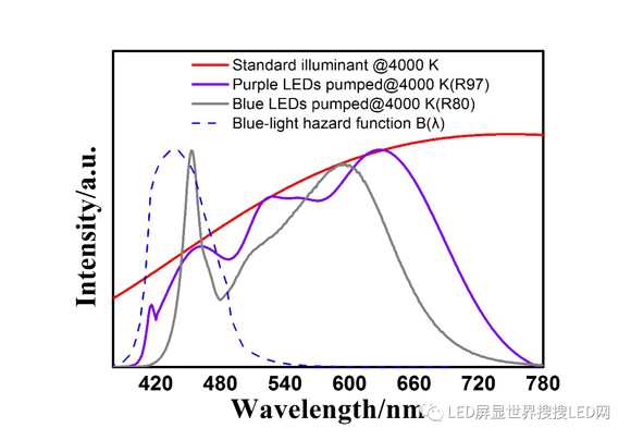 Purple LEDs pumped 4000 K(Ra97,Rf96)