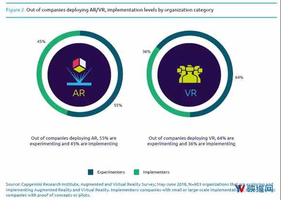報(bào)告指出,美國(guó)和中國(guó)的企業(yè)正在實(shí)施AR/VR的競(jìng)賽中搶先一步,超過(guò)50%的受訪企業(yè)已經(jīng)在商業(yè)運(yùn)營(yíng)中實(shí)施沉浸式技術(shù)。法國(guó),德國(guó),北歐和英國(guó)中則有超過(guò)50%的公司仍在試驗(yàn)AR/VR計(jì)劃。