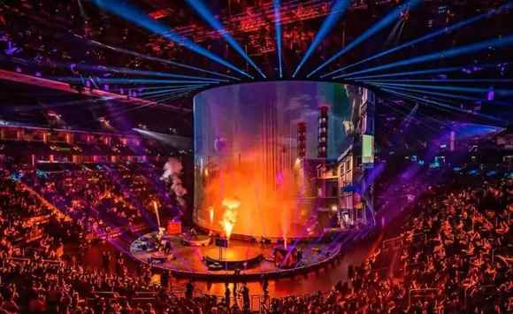 舞臺(tái)中心有個(gè)巨大的360°圓柱紗幕,《絕地求生》的場(chǎng)景不斷的在投影幕墻中變換。
