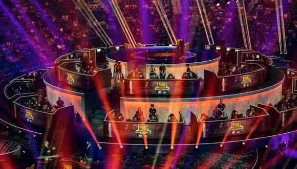 主舞臺(tái)是由重疊交錯(cuò)的大小圓圈作為主題元素,包括評(píng)論席、參賽隊(duì)伍的位置和選手的座椅都是圓形設(shè)計(jì),因?yàn)樗砹恕督^地求生》游戲里面的“毒圈”,會(huì)給選手和觀眾毒圈正在逐步縮小的感覺(jué),營(yíng)造了比賽角逐的緊張氛圍。