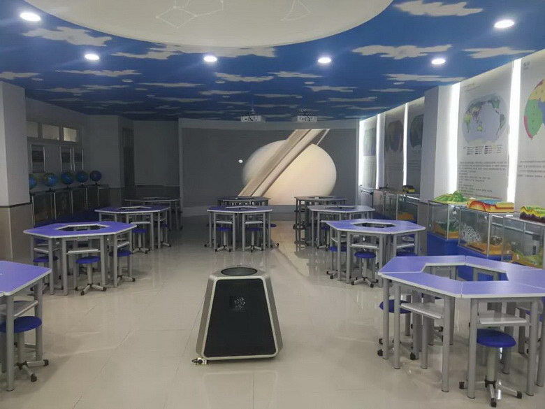 天文演示儀在天花板上投影出一個(gè)圓形的演示穹頂。將學(xué)生的視角由地球范疇,轉(zhuǎn)向太空乃至整個(gè)宇宙,將地理知識(shí)與天文教學(xué)有效整合,使學(xué)生了解地月系、地球與太陽系、地球與銀河系之間的關(guān)系,了解恒星、行星的形成及宇宙的演變過程。