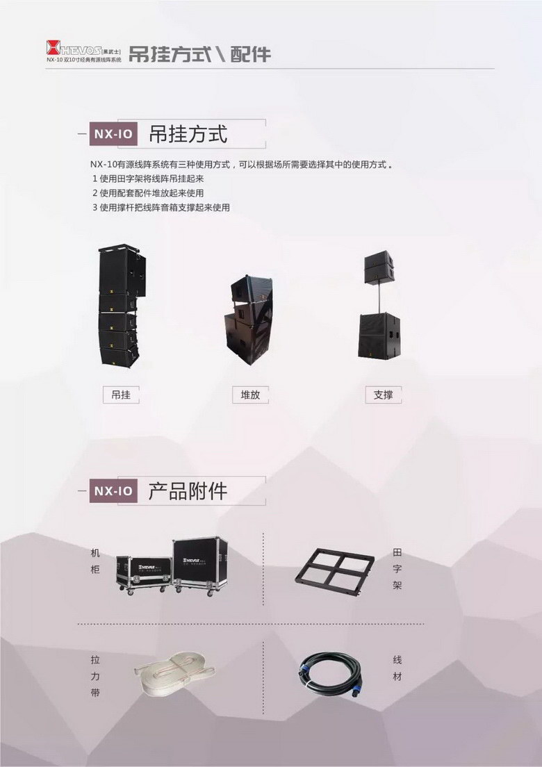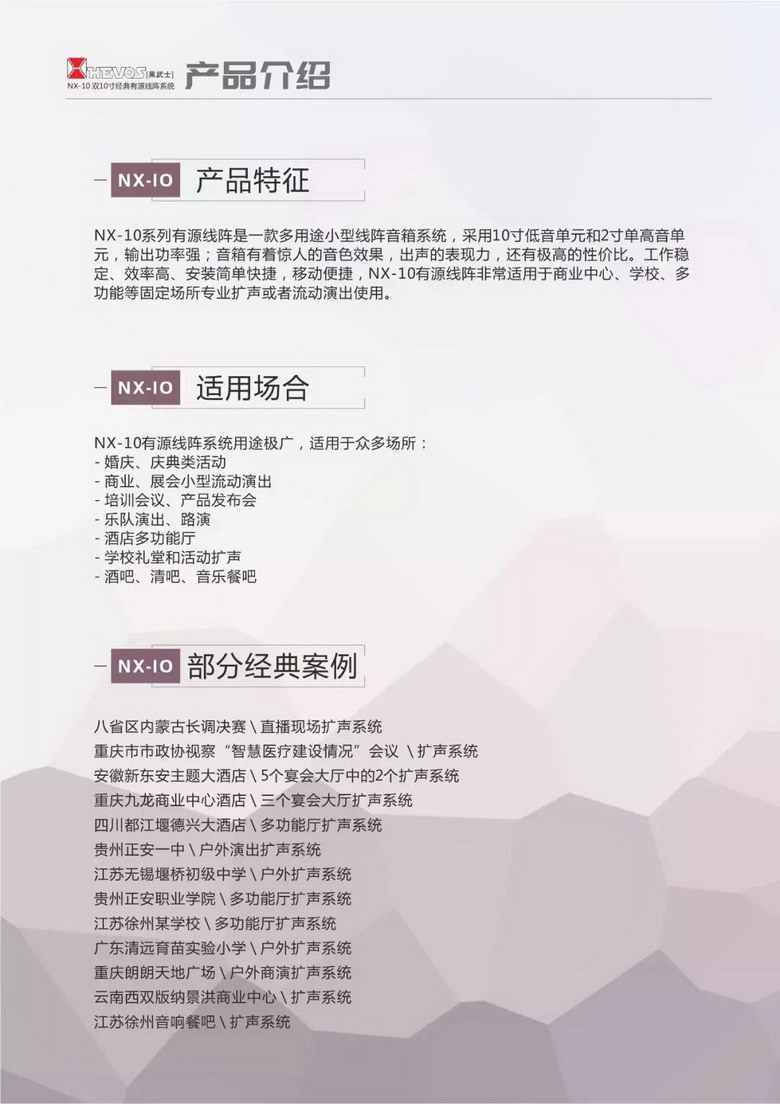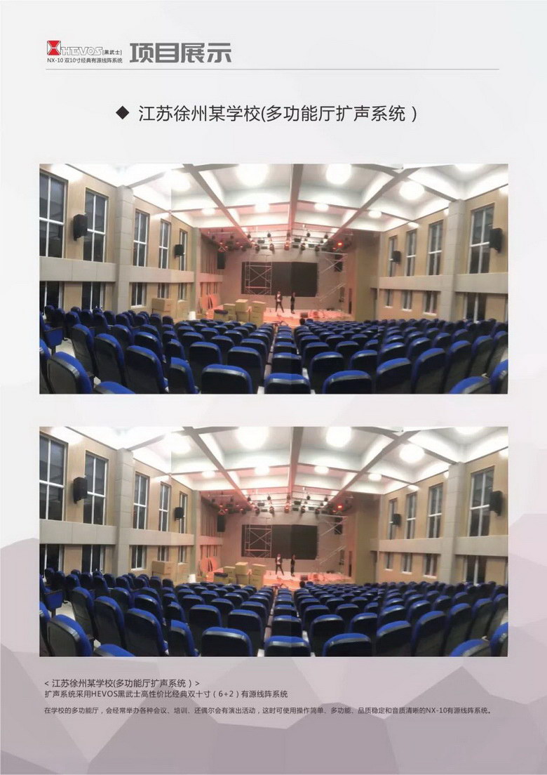 在酒店、學(xué)校、企業(yè)等場(chǎng)所的多功能廳,會(huì)經(jīng)常舉辦各種會(huì)議、培訓(xùn)、婚慶、或相關(guān)文藝匯演等活動(dòng),這時(shí)可使用操作簡(jiǎn)單、品質(zhì)穩(wěn)定、音質(zhì)清晰的NX-10有源線陣系統(tǒng)。
