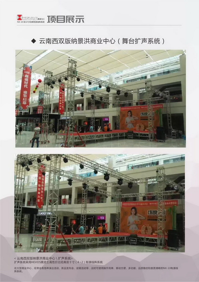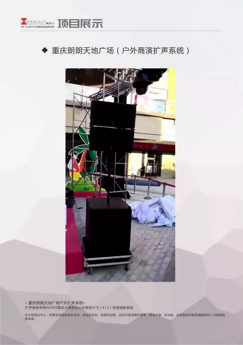 在大型的商業(yè)中心、超市的廣場(chǎng),經(jīng)常需要舉辦一些營(yíng)銷(xiāo)廣播推廣活動(dòng)、需要表演和演奏等,這時(shí)可使用操作簡(jiǎn)單、品質(zhì)穩(wěn)定、音質(zhì)清晰的NX-10有源線陣系統(tǒng)。