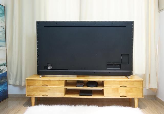 箱子拿走,放上電視,一米八的電視桌終于一展所長,70寸的電視幾乎占滿,而遠遠看去,金屬腳架與超窄金屬邊框的點綴,也讓這一眼望去全是屏幕的大電視多了些質感。