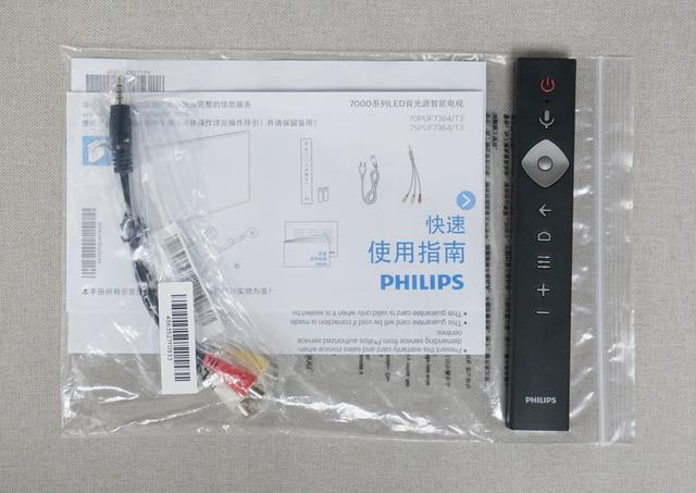 箱子內除了電視本體和已經(jīng)安裝上的兩個腳架、電源線外,還有不用讀系列、一個帶語音功能的遙控器、一根AV OUT連接線和一組電池(已經(jīng)裝入遙控內)。