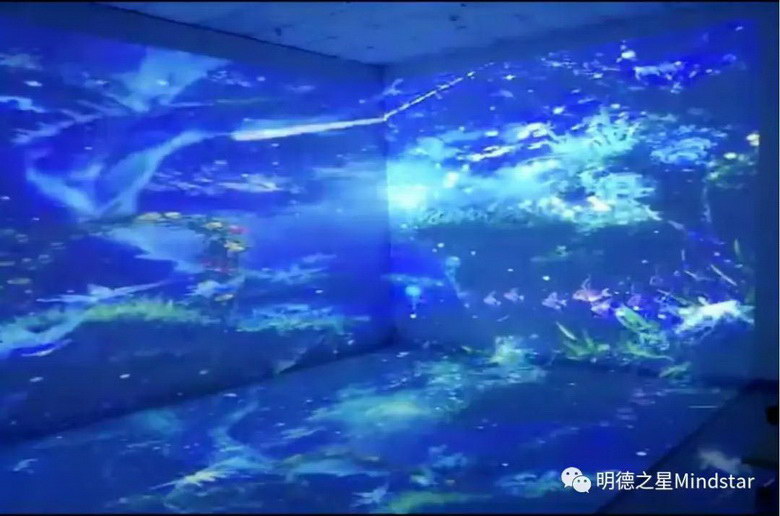 第三個(gè)展示的是明德之星沉浸式體驗(yàn)室,搭配多臺(tái)投影設(shè)備、視頻融合處理技術(shù),實(shí)現(xiàn)墻面地面無(wú)縫拼接顯示,使墻面地面五處投影畫(huà)面可同時(shí)顯示一整個(gè)大畫(huà)面,渾然一體,所虛擬出的具有沉浸體驗(yàn)感的展廳,廣泛用于博物館,展覽會(huì),沉浸式餐廳、娛樂(lè)互動(dòng)場(chǎng)景等應(yīng)用場(chǎng)景。