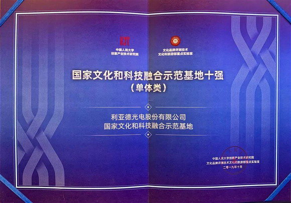2019年10月25日,中國人民大學(xué)創(chuàng)意產(chǎn)業(yè)技術(shù)研究院、文化品牌評測技術(shù)文化和旅游部重點(diǎn)實(shí)驗(yàn)室在2019中國(南京)文化和科技融合成果展覽交易會上發(fā)布了“國家文化和科技融合示范基地十強(qiáng)榜單”。此次,利亞德光電股份有限公司成功入圍單體類基地十強(qiáng)并排名榜首,成為業(yè)界典范。