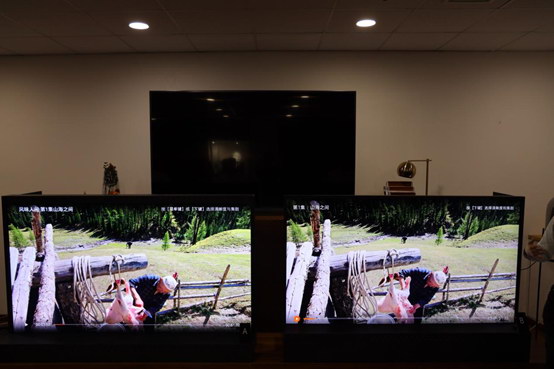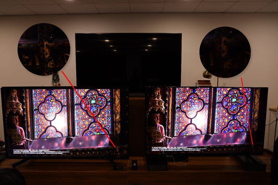 此外,在畫面中間最亮的區(qū)域,右側(cè)電視完全過曝顯得很亮,左側(cè)電視則能看清楚高亮區(qū)域中的畫面細(xì)節(jié)。