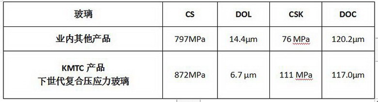 復(fù)合壓應(yīng)力玻璃為新一代鋰鋁硅玻璃,可化學(xué)強(qiáng)化(CS)值在800MPa以上,深度(DOC)高于110µm。