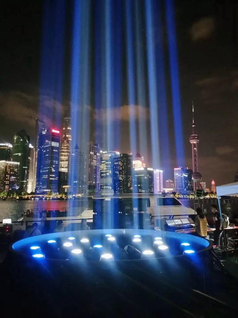 鴻彩燈光旗下的品牌樂(lè)華光電100多臺(tái)光束燈, 均勻的光束閃耀著五彩光芒,把上海北外灘映襯得更加的繽紛。