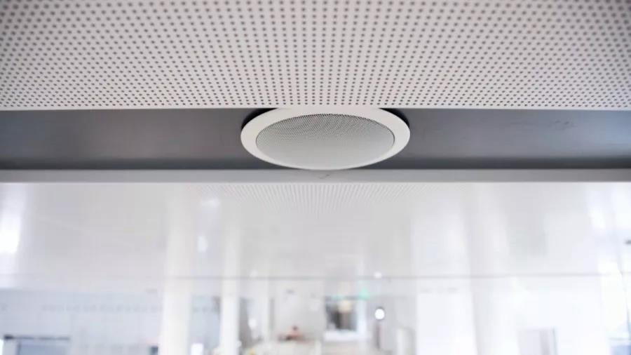 傳統(tǒng)的吊裝揚聲器會產(chǎn)生很多來自天花板的無用反射聲,使得最終聽到的廣播聲音變得渾濁不清,因此我們選用了博世半指向性揚聲器。