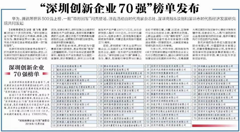 2019年是新中國(guó)成立70周年,在這舉國(guó)同慶的時(shí)刻,時(shí)代商家雜志社、深圳商報(bào)&讀創(chuàng)APP以及深圳市新經(jīng)濟(jì)發(fā)展研究院共同主辦了“深圳創(chuàng)新企業(yè)70強(qiáng)”評(píng)選活動(dòng),并以此為祖國(guó)的70華誕獻(xiàn)禮。評(píng)選歷時(shí)近一年時(shí)間,組委會(huì)在深圳數(shù)萬家高新技術(shù)企業(yè)中評(píng)選出最終的“創(chuàng)新70強(qiáng)”。