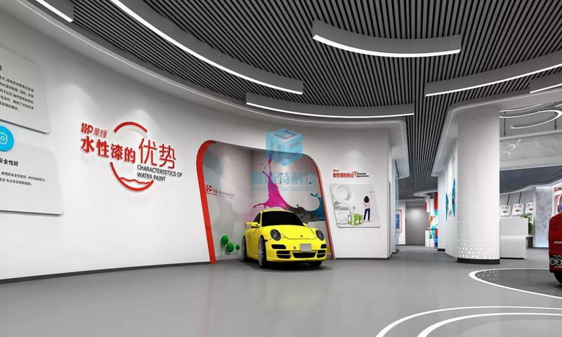 明亮的空間給人遼闊之感,還能提高產(chǎn)品的展示效果。在整個(gè)展廳的內(nèi)容展陳上,重點(diǎn)突出汽車涂料的性能和工藝,讓參觀者獲得對(duì)產(chǎn)品的直觀體驗(yàn)。