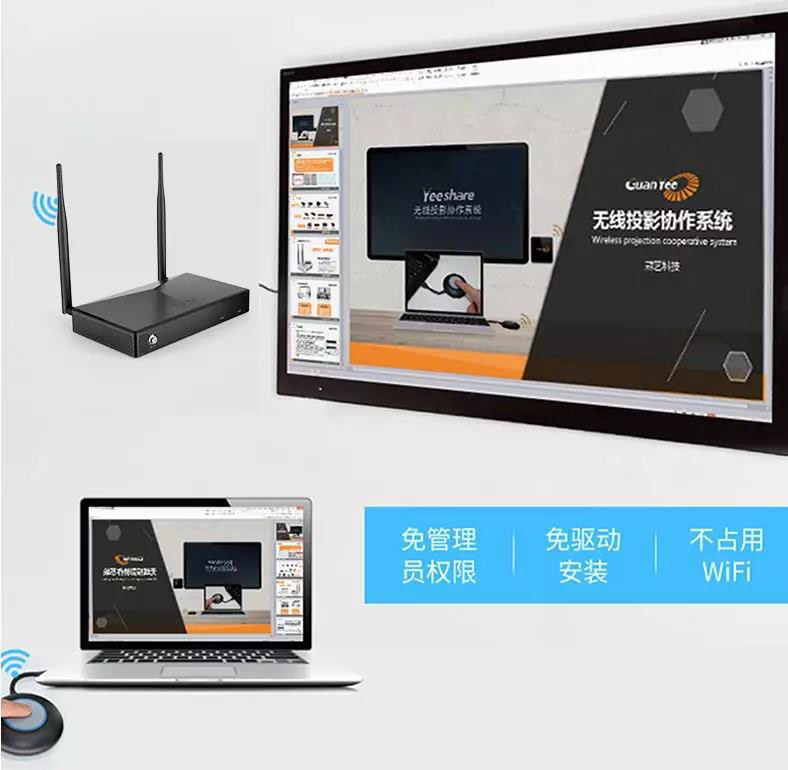 【冠藝GUANYEE】無線投屏高效協(xié)作系統(tǒng):WHD-G801,是一款支持筆記本電腦、平板電腦等跨平臺(tái)多操作系統(tǒng)混合使用的高分辨率無線投影協(xié)作系統(tǒng)。用戶無需安裝軟件、設(shè)置、配置,也無需聯(lián)網(wǎng),只需將USB發(fā)射器插入電腦,稍等片刻即可無線傳屏,高清1080P 立刻無線呈現(xiàn)。