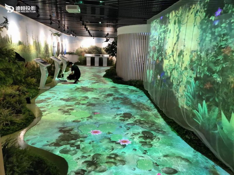 互動(dòng)投影,是參與者與影像的互動(dòng)。互動(dòng)投影分為地面互動(dòng)投影、桌面互動(dòng)投影、墻面互動(dòng)投影。采用投影設(shè)備把影像效果投射到地面、墻面、桌面,當(dāng)參訪者身處投影區(qū)域時(shí),通過系統(tǒng)識(shí)別,參訪者可以直接使用身體與投影幕上的虛擬場景進(jìn)行互動(dòng),互動(dòng)投影效果就會(huì)隨著你的行動(dòng)產(chǎn)生相應(yīng)的變幻。
