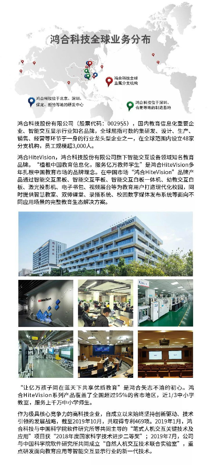 鴻合科技,國內(nèi)教育信息化重要企業(yè),智能交互設(shè)備領(lǐng)域知名品牌。自公司成立以來始終堅持“自主創(chuàng)新 永續(xù)發(fā)展”的戰(zhàn)略目標(biāo),目前擁有國內(nèi)技術(shù)力量雄厚、綜合生產(chǎn)能力強(qiáng)的數(shù)字多媒體交互產(chǎn)品以及現(xiàn)代化教育設(shè)備生產(chǎn)基地。